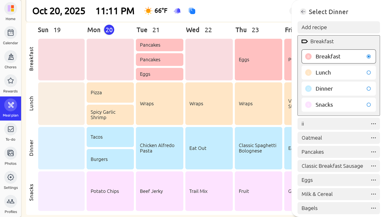 - To add multiple meals for a single mealtime, tap and hold the tile, then select additional meals to include.