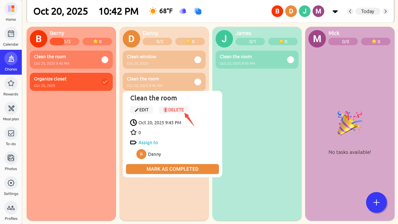 Mark a Chore as Complete Tap the white circle to the right of the chore name. You can also mark a chore as complete from the Details window: Tap the chore you want to update. A pop-up window will appear showing the chore details. Tap Mark as ...