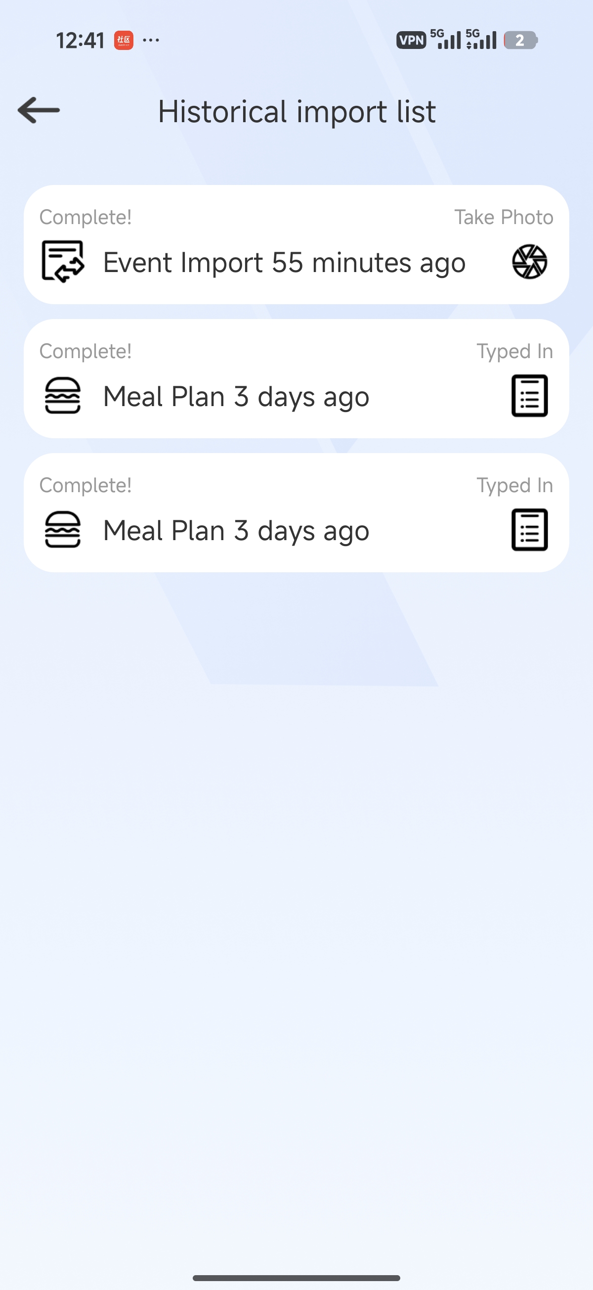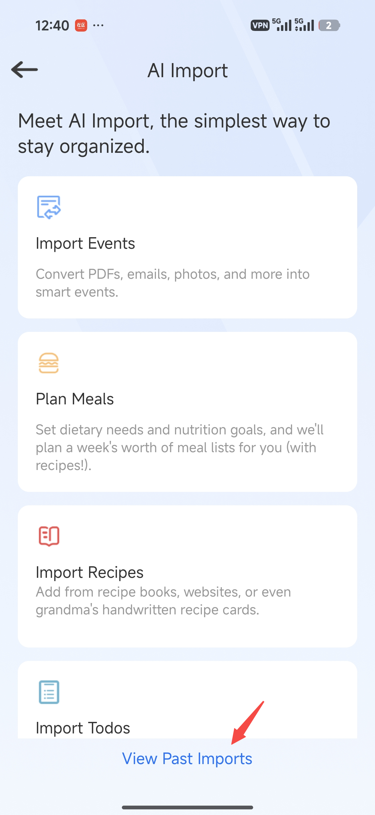- You’ll see all your previous imports, including Events, Plans, Recipes, and To-Dos.