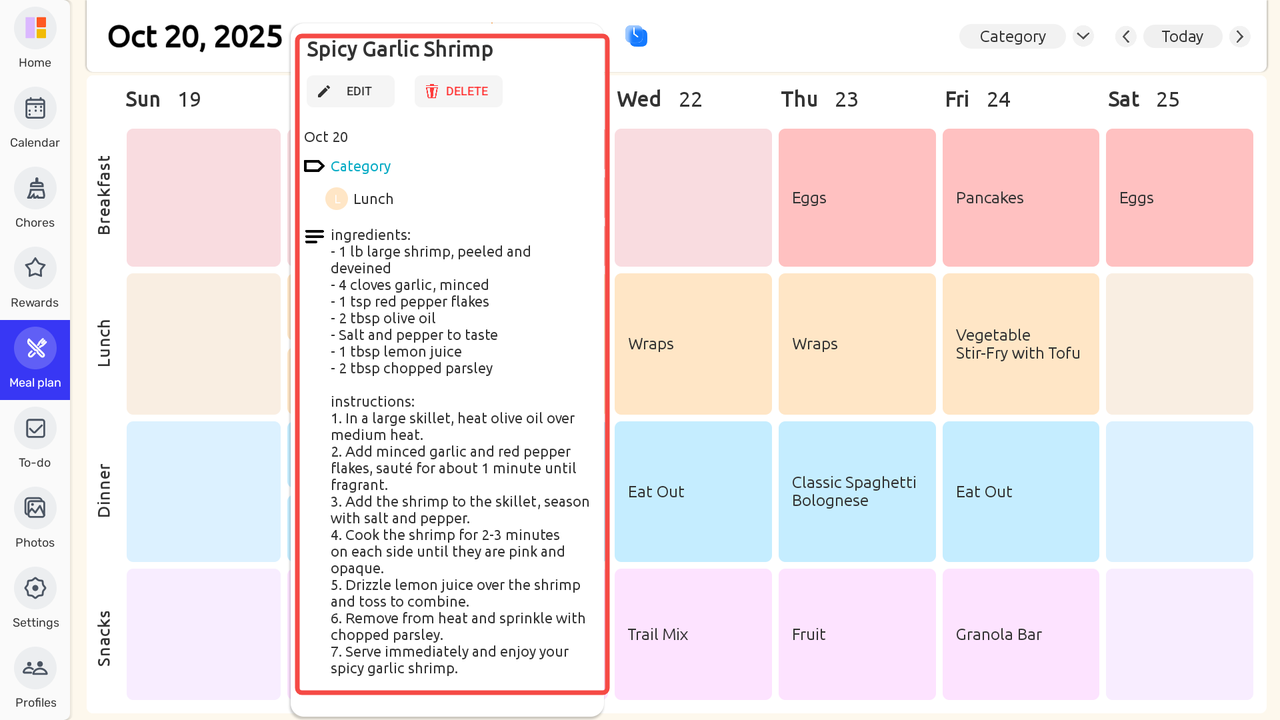 - Change the meal category (Breakfast, Lunch, Dinner, or Snack).