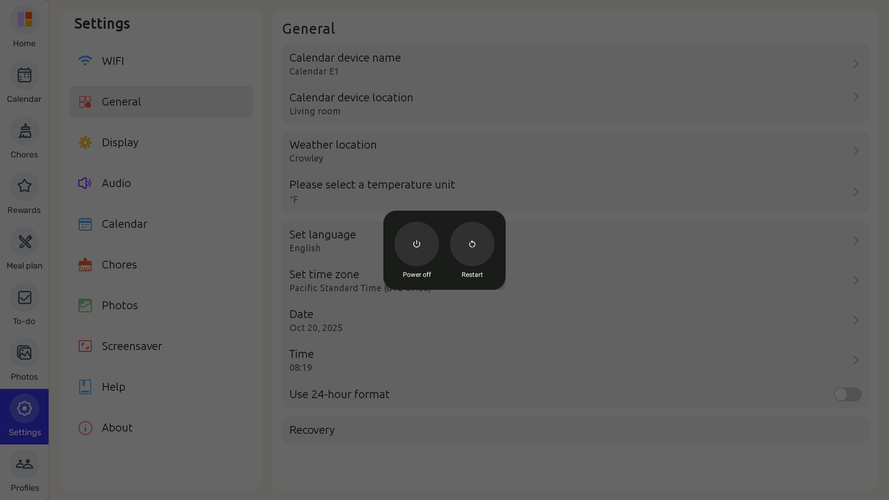 - On your Everblog Calendar, go to Settings → General → Recovery, then tap Confirm to reset the device.