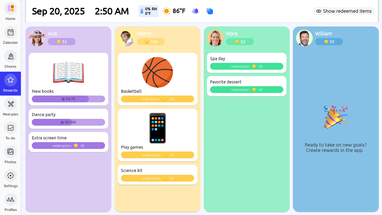 The Reward Feature on your Everblog Calendar motivates family members—especially kids—by awarding reward stars when chores are completed. Parents can convert stars into incentives, for example: 10 stars = extra screen time 20 stars = a family movie ...
