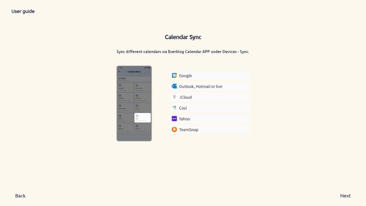 Open the app and sync your existing events, or import external calendars (Google, Yahoo, Outlook, etc.) to your Everblog Calendar.